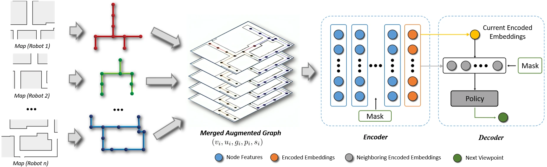 IR2 propose a novel information-sharing strategy that achieves high exploration efficiency by estimating the future impact of current exploration and rendezvous decisions. There are three key contributions to our proposed work: (1) We use an attention-based neural network trained by deep reinforcement learning (DRL) to help robots learn to sequence non-myopic decisions. (2) We implement two-stage curriculum learning, where robots are placed in increasingly difficult exploration environments with increasing frequency and duration of disconnectivity. This drives robots to learn complex, dynamic connectivity strategies to attain even higher exploration efficiency. (3) We utilize a hierarchical graph formulation, to enable scaling of our strategy to large-scale environments. This involves maintaining both a sparse global graph representation of the robots’ map and a dense local graph centered on the robot. Combining graphs at different spatial scales helps robots strike a balance between long- and short-term exploration and rendezvous goals.